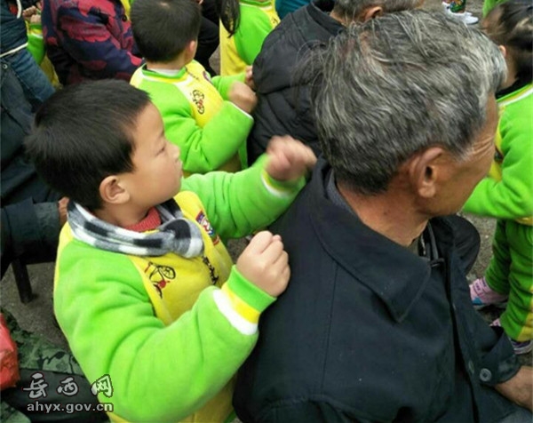 一到敬老院,小朋友们就给爷爷奶奶们献上暖心礼物:水果、糕点、水杯等,让老人们感到无比的激动和温馨。随后,小朋友们载歌载舞,为老人们表演了精彩的节目,博得老人们掌声阵阵。表演结束后,小朋友为爷爷奶奶敲敲背、捶捶腿,围着他们做游戏。最后,孩子们齐声给爷爷奶奶们送上了自己最诚挚的祝福:祝愿爷爷奶奶新年快乐、身体健康、生活幸福!