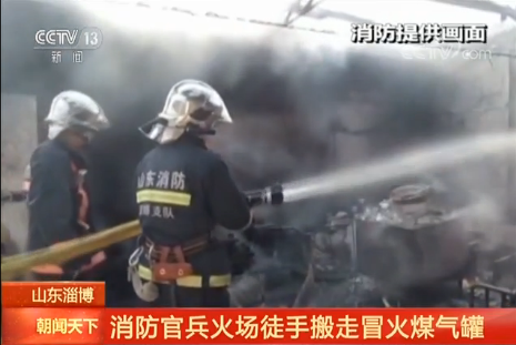 淄博市公安消防支队博山区大队城东中队战斗员 景慎林:火被控制住以后,我们发现院内还有一个正在燃烧着的煤气罐,罐口窜出大约半米高的火焰。如不及时处置,会造成很严重的后果。