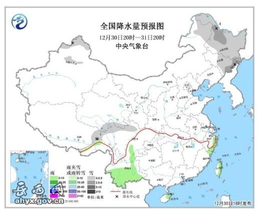 31日20时至2018年1月1日20时,新疆东北部、青海南部、内蒙古东北部、黑龙江等地的部分地区有小到中雪,其中黑龙江东部局地有大雪;云南中西部、贵州东部、湖南中部、海南岛东部等地的部分地区有小雨或阵雨;新疆北部、内蒙古中东部等地的部分地区有4~6级风。台湾海峡、南海部分海域将有7~8级、阵风9级的东北风。