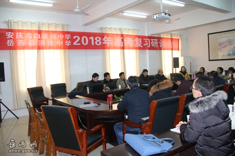 近日,安庆市白泽湖中学到汤池中学联合开展2018高考复习研讨会活动。省特级教师、安庆二中副校长邱国民,汤池中学校长苏岳祥、副校长储孟伦,白泽湖中学校长饶玉流、副校长王孝来出席。两校相关处室负责人、学科备课组长、部分高三教师与会。