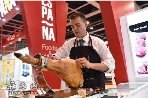 5月9日,来自西班牙的参展人员在亚洲国际食品及餐饮设备展现场展示西班牙火腿切片。(新华社)