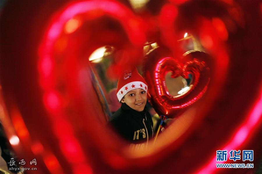2017年12月31日晚,在埃及首都开罗,一名小男孩在新年前夕手拿气球拍照留念。