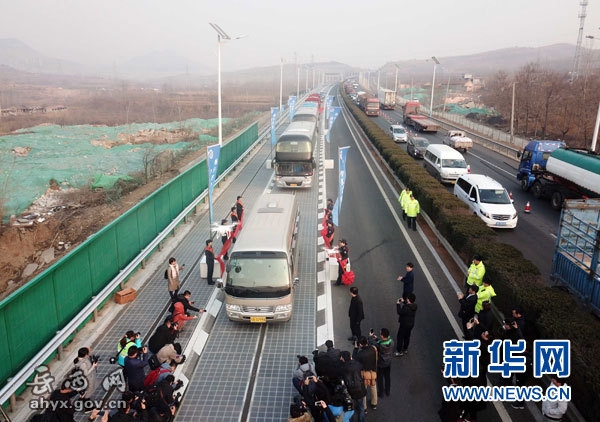 车辆在承载式光伏高速公路上行驶(12月22日摄)。 12月28日,我国首个承载式光伏高速公路试验段在济南建成通车,实现利用高速公路路面并网发电。光伏路面铺设长度1080米、净面积5875平方米,铺设主行车道和应急车道;分布式光伏并网发电装机容量峰值功率817.2千瓦,预计可实现年发电量约100万千瓦时。新华社记者朱峥摄