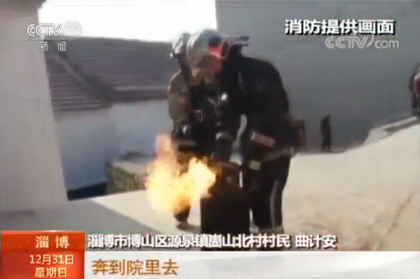 淄博市公安消防支队博山区大队城东中队战斗员 景慎林:火被控制住以后,我们发现院内还有一个正在燃烧着的煤气罐,罐口窜出大约半米高的火焰。如不及时处置,会造成很严重的后果。