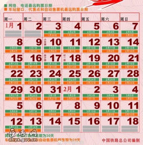 根据中国铁路总公司编制的“2018年铁路春运购票日历”,2018年春运自2月1日开始,3月12日结束。1月3日,春运首日火车票将正式开始预售。