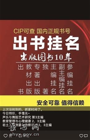 而在朋友圈做“挂名主编”生意的“韩编辑”则公开承认自家是济南某信息咨询公司,坦言其就是“中介”。“韩编辑”还透露挂名的出版社通常都比较差,能出独著的出版社品质更高,但出版的题材内容却受限。“到底选哪种方式,还得以你评职称的要求而定。”“挂名”的书一般只印两本,加印数量多,还需另外加钱。“如果你想送朋友还可以多印,这个没有限制。100本的印刷费是2000元。”