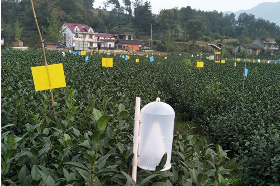 示范区集农业防控、物理防控、生物防控和化学防控于一体,重点推广灯光诱杀、色板诱杀、性信息素诱杀、生物药剂控害、秸秆覆盖除草和茶园套种苜蓿等技术措施,依托病虫测报适时开展统防统治。示范区新安装风吸式茶园杀虫灯30盏,灰茶尺蠖新型飞蛾诱捕器2000套,黄(蓝)板3万张。